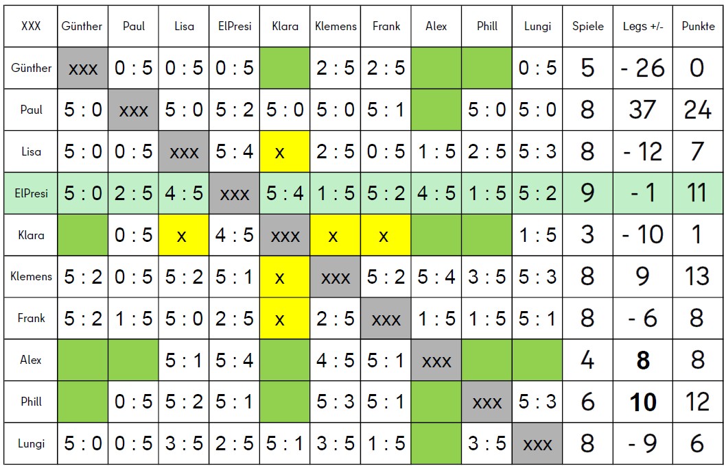 Die Vorrundenspiele sind bis auf das Spiel Alex – Paul abgeschlossen. Da beide bereits für die Finalrunde qualifiziert sind und das Ergebnis dieses Spiel keinerlei Einfluss auf die Tabelle hat wird noch entschieden ob dieses Spiel am Finaltag nachgeholt wird. Günny ist leider ausgefallen, so dass die noch offenen Spiele mit 0:5 gewertet wurden. Wir wünschen auf diesem Weg gute Besserung und werden ihn hoffentlich im nächsten Jahr wieder an der Dartscheibe sehen!